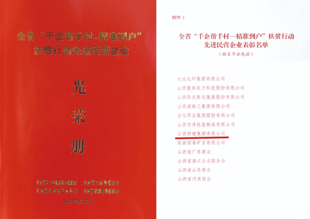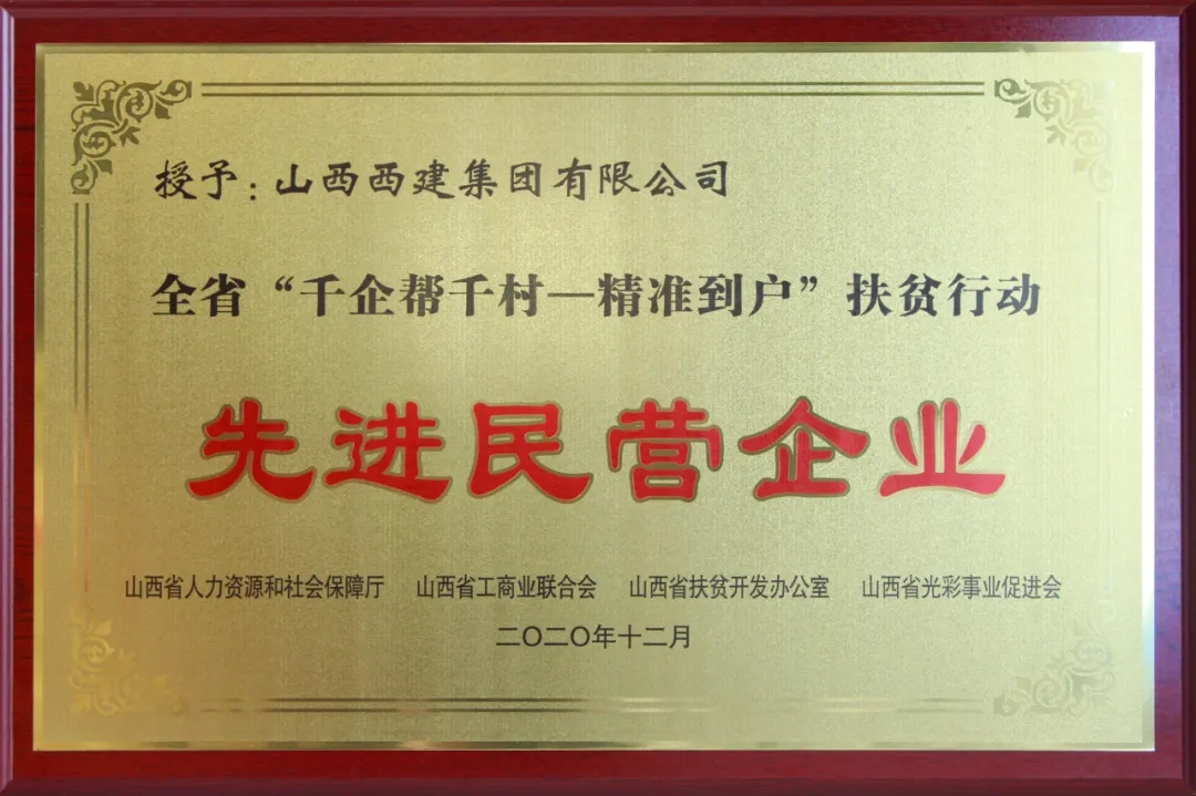 12月10日,在太原召開的山西省工商聯(總商會)十二屆七次常委會議暨全省“千企幫千村——精準到戶”扶貧行動先進民營企業表彰大會上,山西西建集團榮獲“千企幫千村——精準到戶”扶貧行動先進民營企業榮譽稱號。